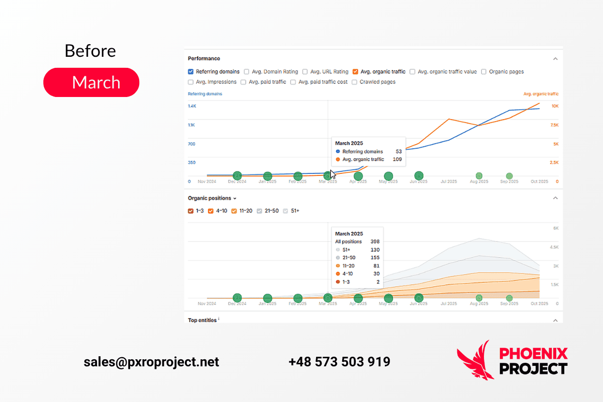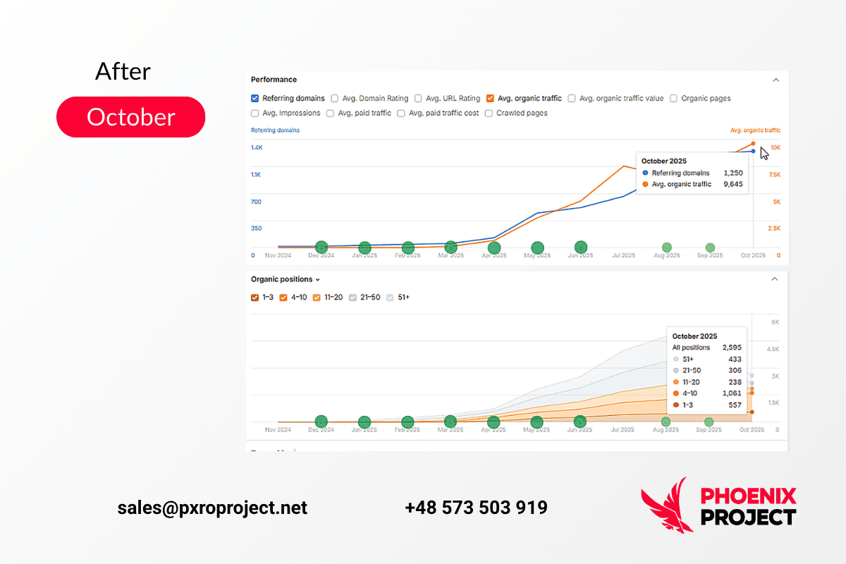In month four, we recorded the first breakthrough: +280% keyword visibility across targeted clusters. Key categories entered the Top-20, and it is secured Top-10 within two more months.
