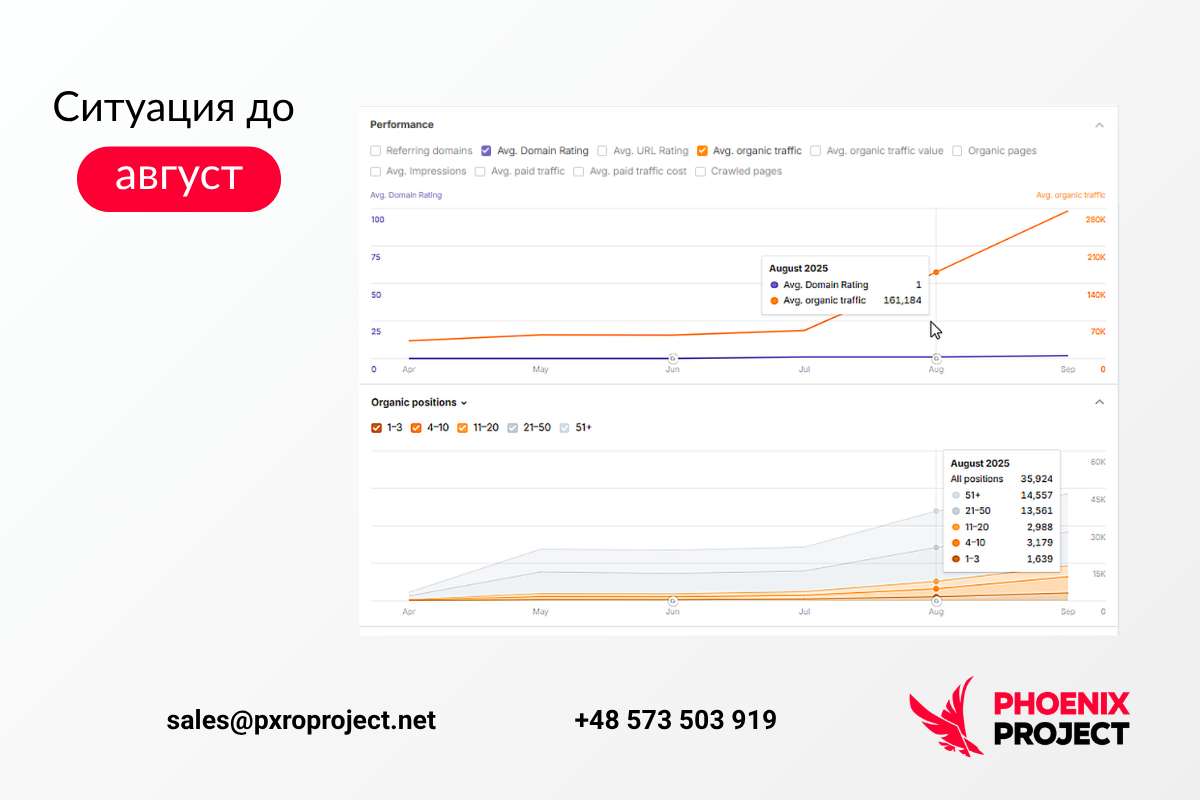 К нам обратился клиент для продвижения сайта онлайн-кинотеатра . Сайт уже имел существенный объем контента и базовый трафик, но сталкивался с двумя ограничениями: главная страница слабо держала брендовые запросы, органический рост по долгам и конкурентные кластерные запросы были ограничены. На момент старта (август 2025 г.) по данным аналитического проекта было ≈161 184 показана видимость и видимость по ключам — 35 924. DR был минимален (≈1).