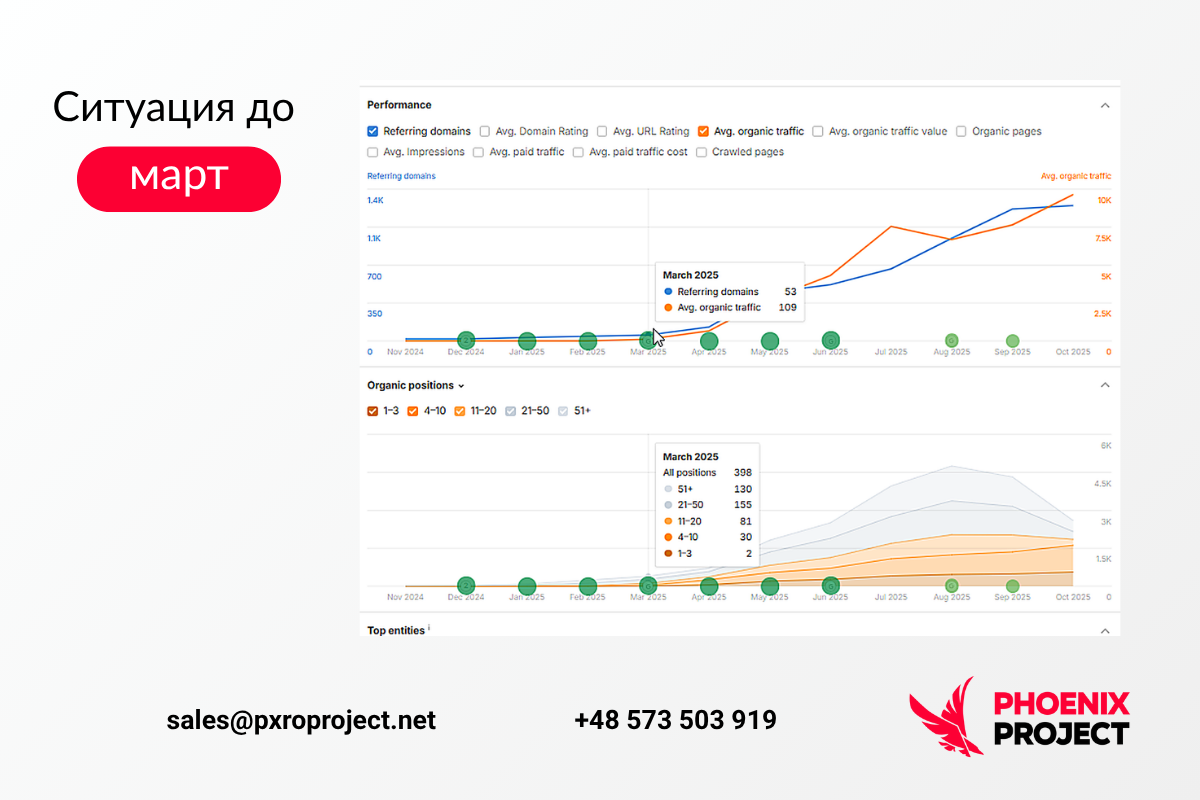Также мы работали над локальными факторами — подключили сабмиты и каталоги, релевантные для СНГ, где аудитория активно ищет обучающие ресурсы по арбитражу. Это дало дополнительное повышение доверия поисковых систем и рост по региональным запросам.
