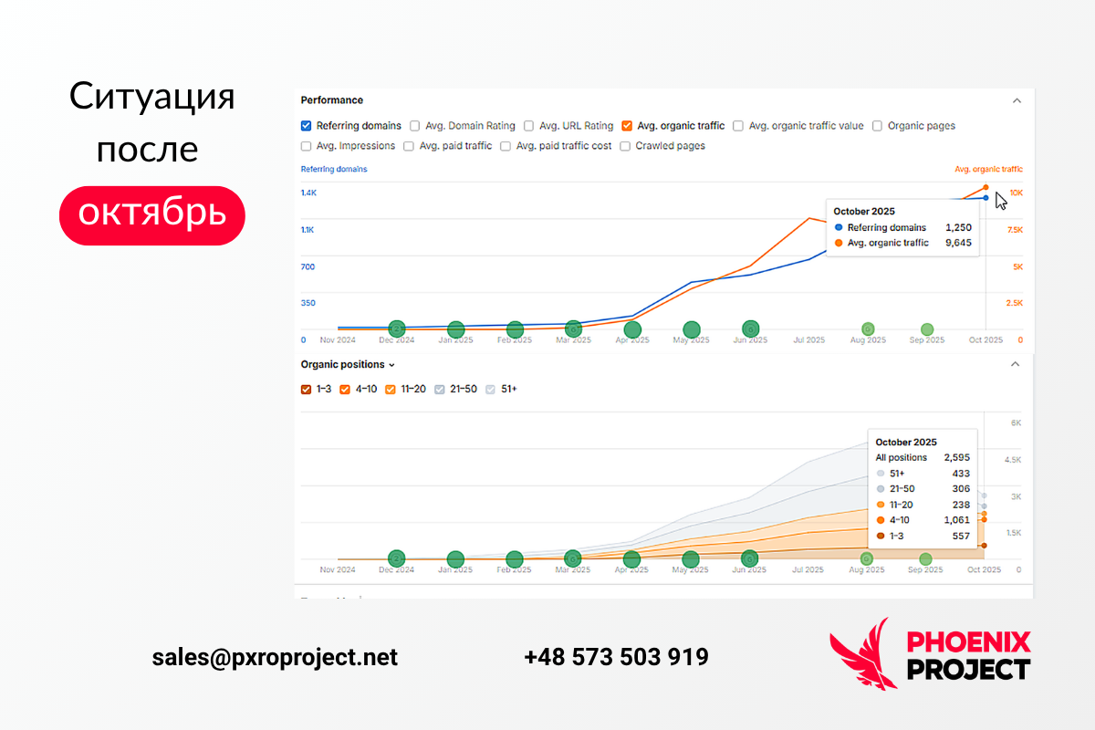 К сентябрю 2025 года органический трафик вырос со 109 до 9 645 пользователей, а ключевой запрос, по которому ранее не было далеко, начал применять регулярные переходы. Это дало стабильную посещаемость арбитражного медиа-сайта и рост заявок на сотрудничество через партнерские программы.