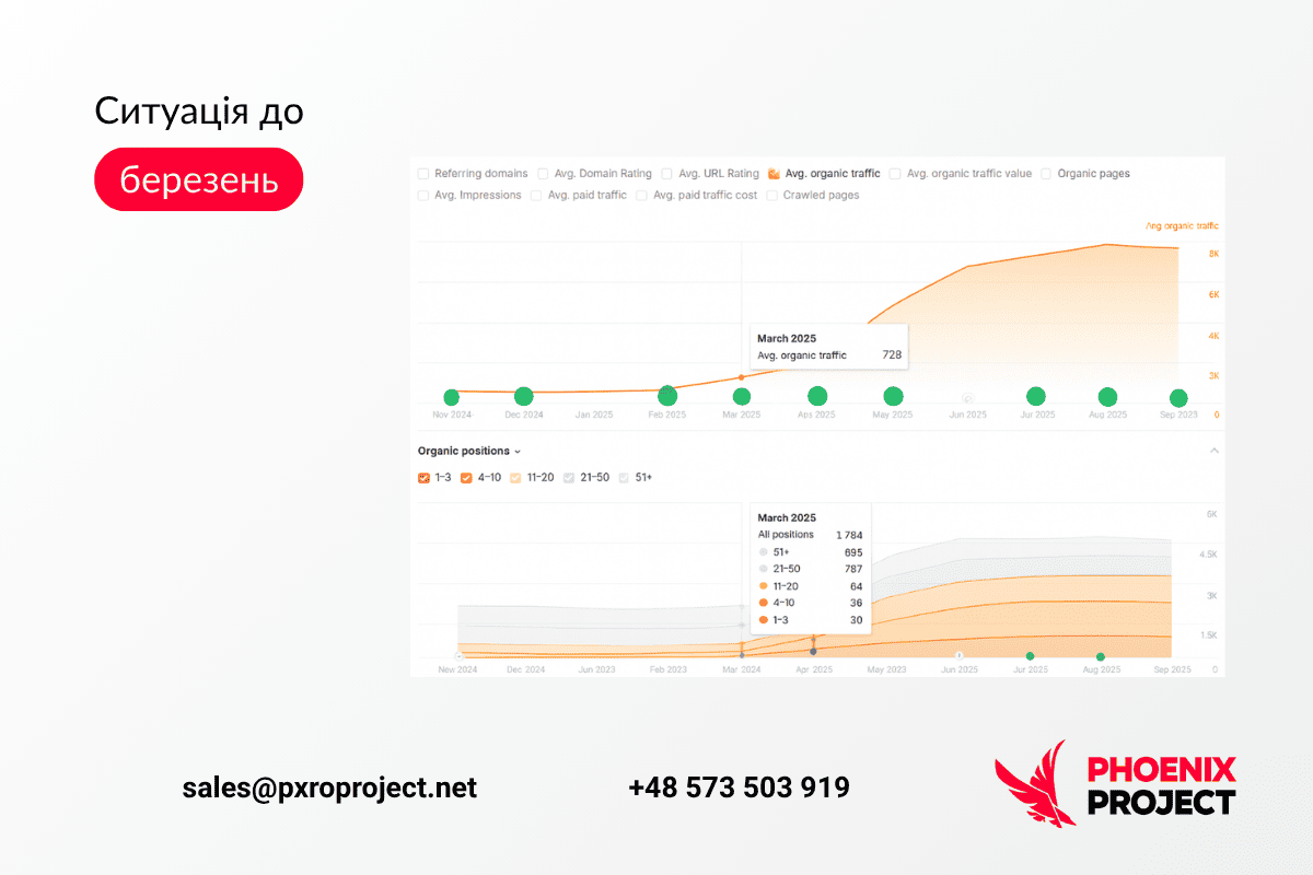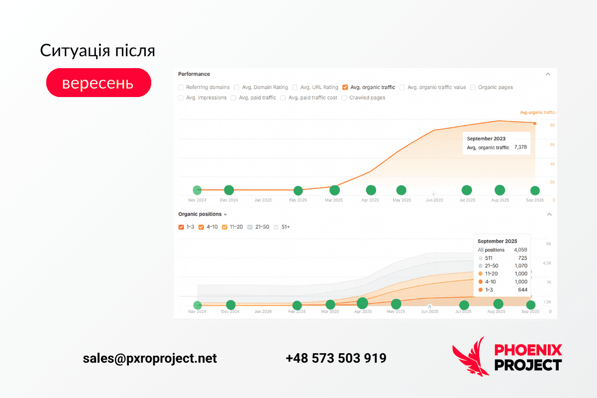 Фактично за 6 місяців сайт із середняка перетворився на сильного гравця ніші: органика стала основним джерелом лідів, а метрики продовжують зростати навіть без агресивного нарощування посилань.